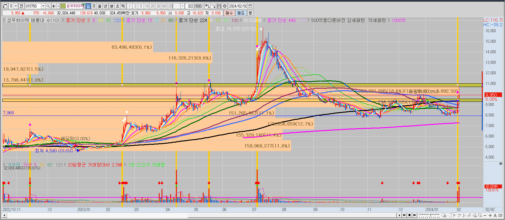 2023년7월경 만든 신고가 상승분을 모두 반납하고 8,000원 부근에서 지지라인을 형성해줬다. 이후 저PBR 대책으로 장기이평선인 224일선을 돌파하면서 추세 전환을 시도하고 있다. 224일선을 갭으로 돌파해준만큼 224일선 지지여부가 중요해보인다. 이후 1차 저항라인은 11,000원 부근에 위치해 있기 때문에 해당 가격대의 돌파여부도 체크해봐야할 것 같다.