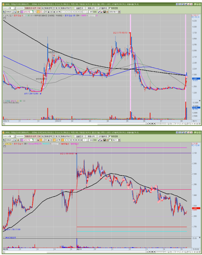 미국과 협상 진행중인 상황에서 전일 거래대금 250억 터진 이후 시가 갭으로 224일선 위에서 출발
