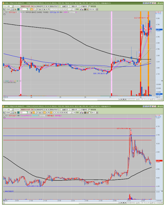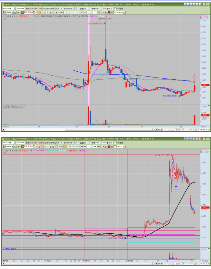 급등 하던 종목 첫 3일선 하락, 분봉상 10% 넘게 급락하는 모습 확인