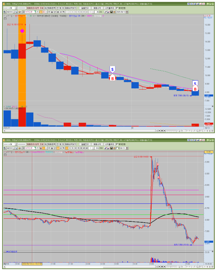 시황도 좋고 일봉도 바닥이라 매매했다. 디마크상단에 최대한 붙여서 디마크 상단 기준으로 잡았으면 더 좋은 매매가 됐다. VI 풀리고 3분선 꺠는 듯해서 털렸는데 더갔다. 아쉽다. 시황을 보면서 좀더 길게 봤어야 맞긴하다.