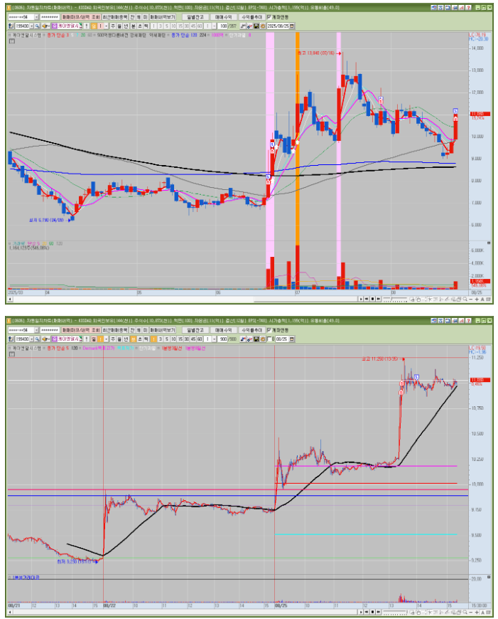 로봇 섹터가 강한 상황에서 이평선 뚫고 분봉이 반등하는 상황