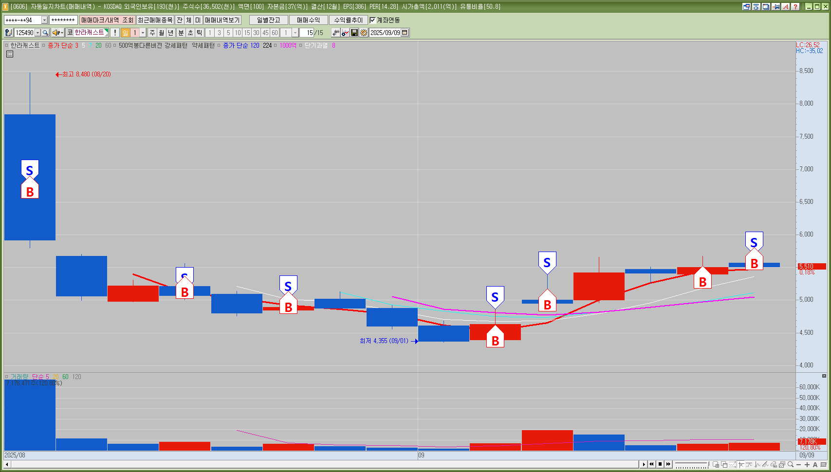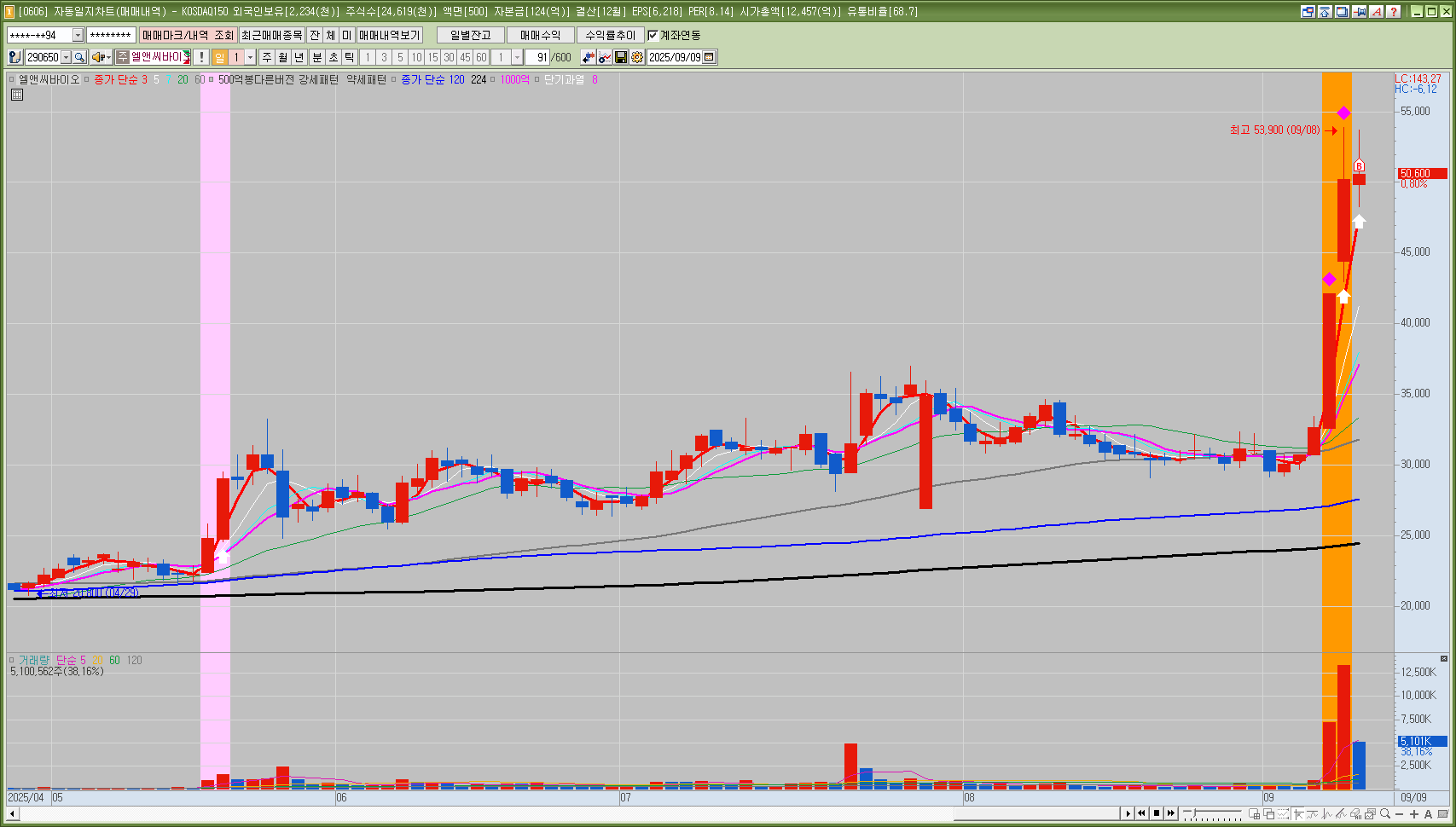 전일 6400억 거래대금 터지면서 고가기준 역사적신고가 돌파 시가 및 120분선 다시 잡아주면서 역사적 신고가로 강하게 뚫어주려는 모습 확인, 9시56분경 아시아경제에서 자극적인 재목의 재료 표출되면서 분봉 강하게 반등 순간 분봉 거래대금 150억유입
