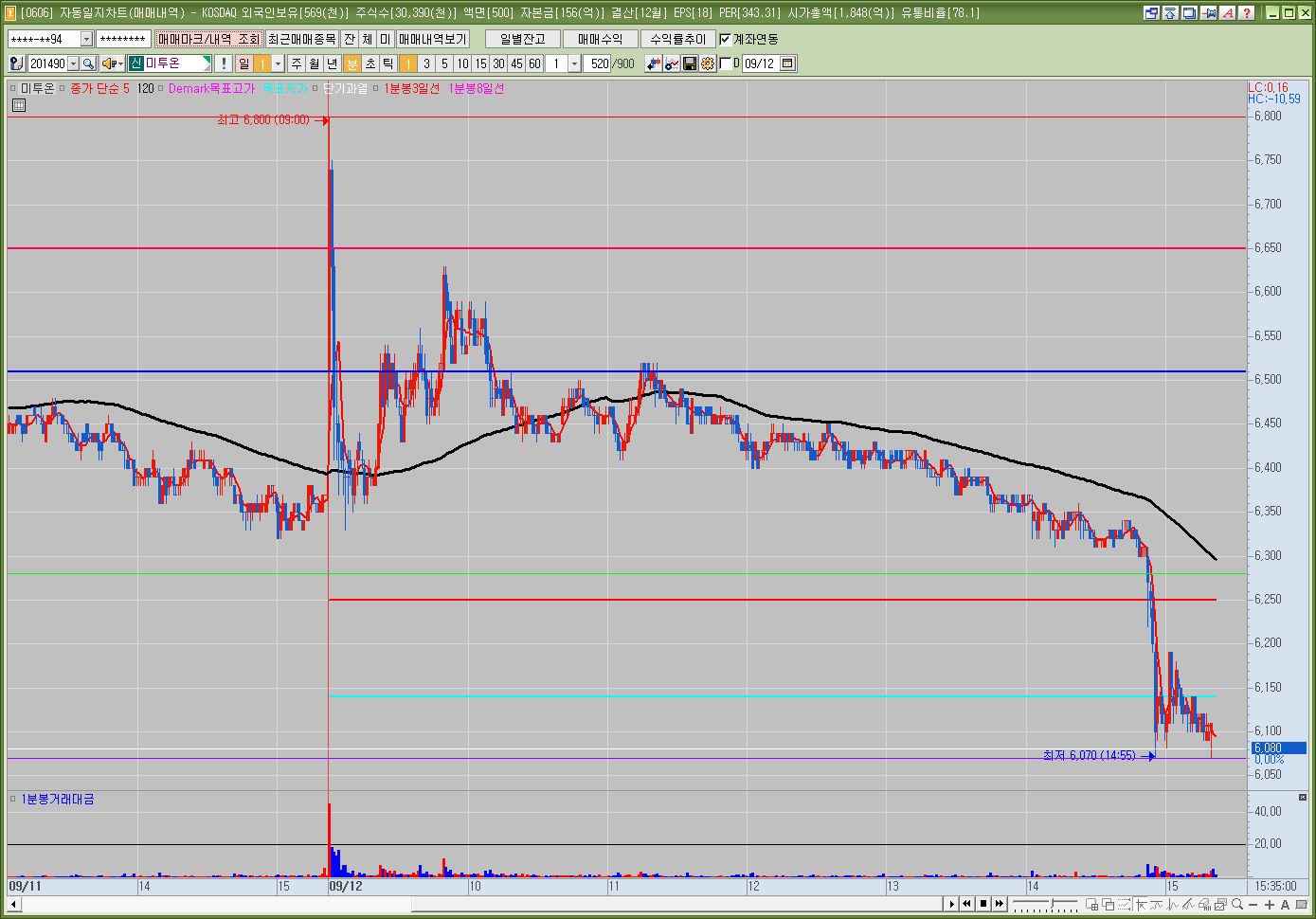 ![]() 분봉 : 단독기사 표출로 분봉 강하게 슈팅주는듯 했으나 거래대금 및 거래량 들어오지 않으면서 윗꼬리 달고 하락