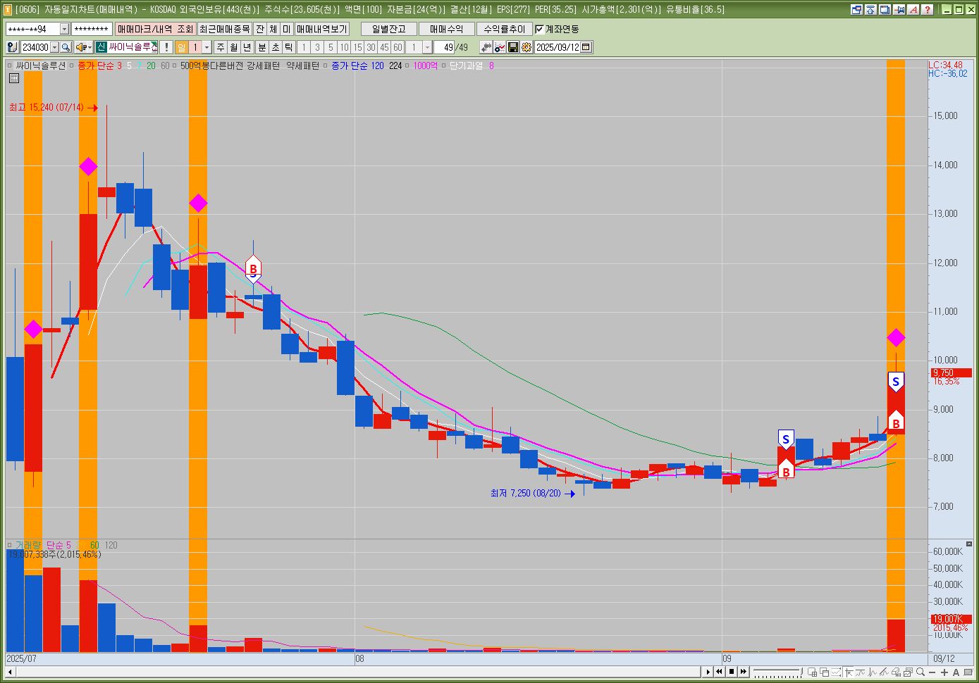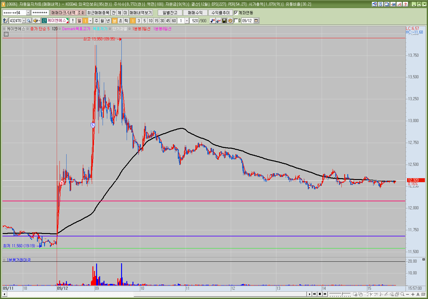 바닥권에서 10억 거래대금으로 224일선 뚫어줬을때 1차로 관심갖고 11일에 재료 체크하면서 120분선 기준으로 매매가능했다.