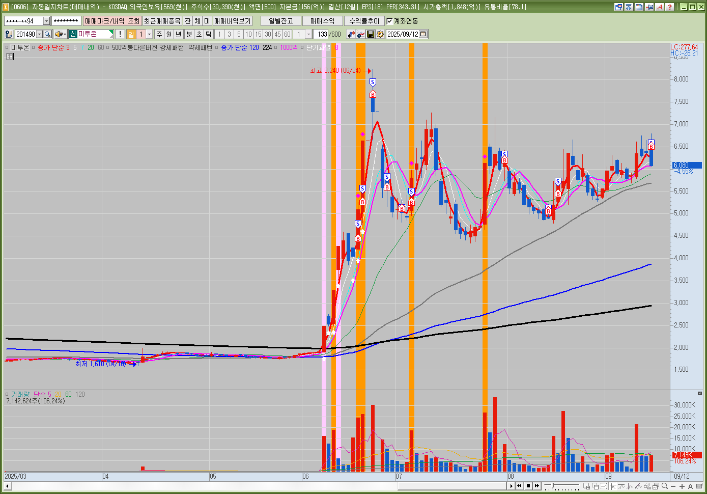 일봉 : 9월10일 거래대금 260억으로 224일선 강하게 뚫어주고 전일 거래량 감소한 음봉으로 224일선 지지 오늘 재료 표출되면서 10일 고점 뚫어주는 슈팅