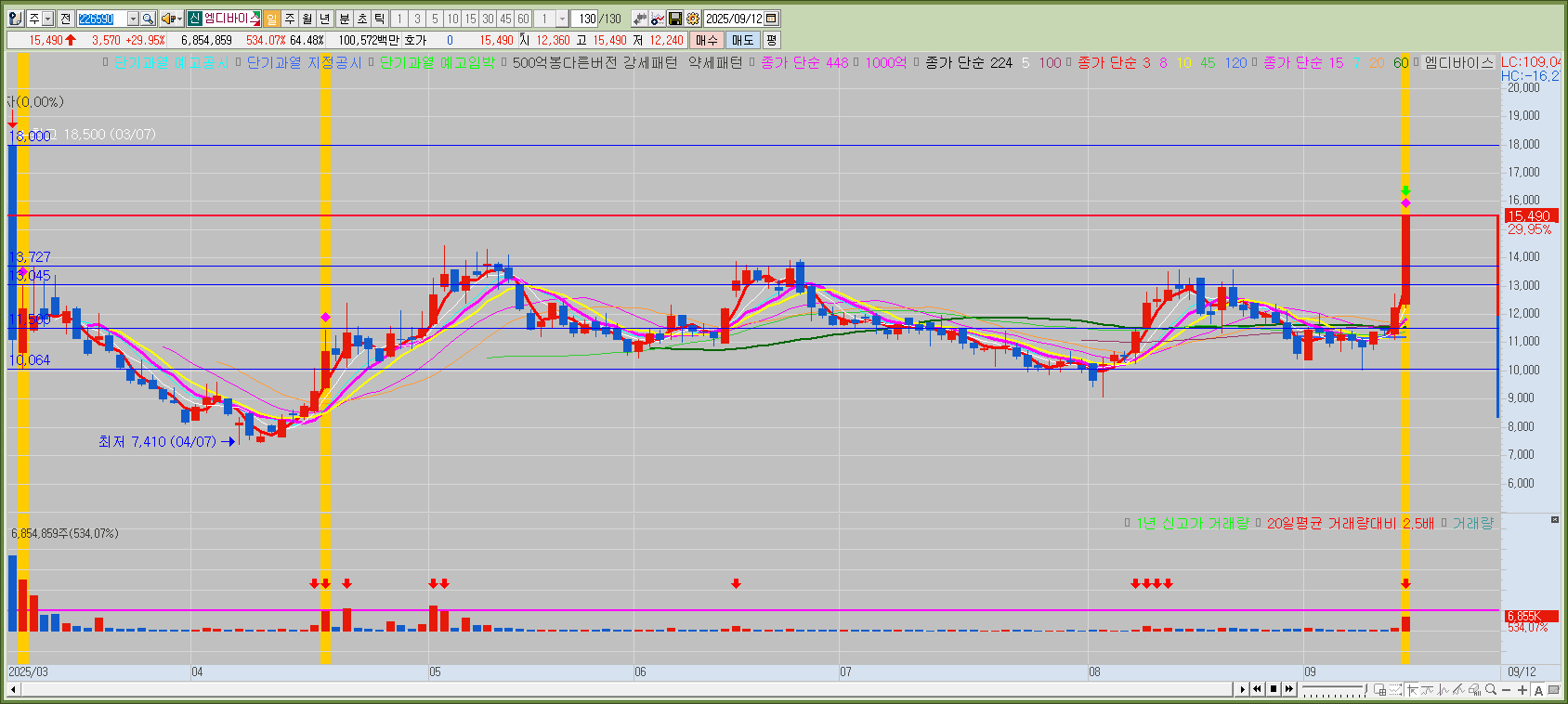 엠디바이스는 올해 3월 7일 상장한 신규상장주로 상장 직후 지속 하락하여 공모가 8,350원을 하회하다가 오늘 SK하이닉스 등이 신고가를 기록하면서 반도체 시황이 도래함에 따라 상장시가부근으로 반등하는 모습을 보여주고 있다. 엠디바이스는 AI데이터센터에 들어가는 SSD기업으로 AI 및 데이터센터 관련 산업이 부각될 수록 실적이 개선될 수 있다. 재무상태가 나쁘지 않기 때문에 거래대금이 강하게몰리거나 중국발 재료가 붙어주면 관심을 가져볼만하다. 다만 SK하이닉스나 삼성전자 쪽 보다는 사실 중국쪽 매출비중이 매우 높은 기업이기 때문에 단순히 SK하이닉스나 삼성전자가 강하다고 매매하면 낭패를 볼 수 있다. 개별적인 재료나 시황을 면밀하게 지켜보면서 투자를 고려해야한다.