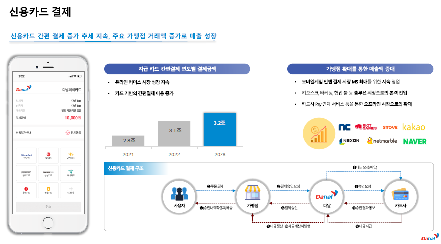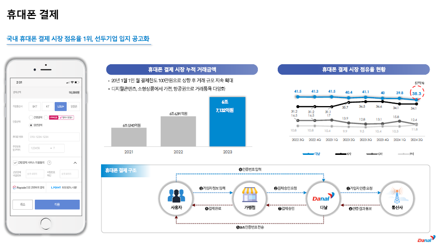 다날은 휴대폰결제, 신용카드, 가상화폐, 간편결제까지 아우르는 종합 PG 기업으로 쿠팡 내 점유율이 60% 이상인 PG 점유율 1위 업체로 알려져 있어 투자자들의 관심이 몰리고 있다.