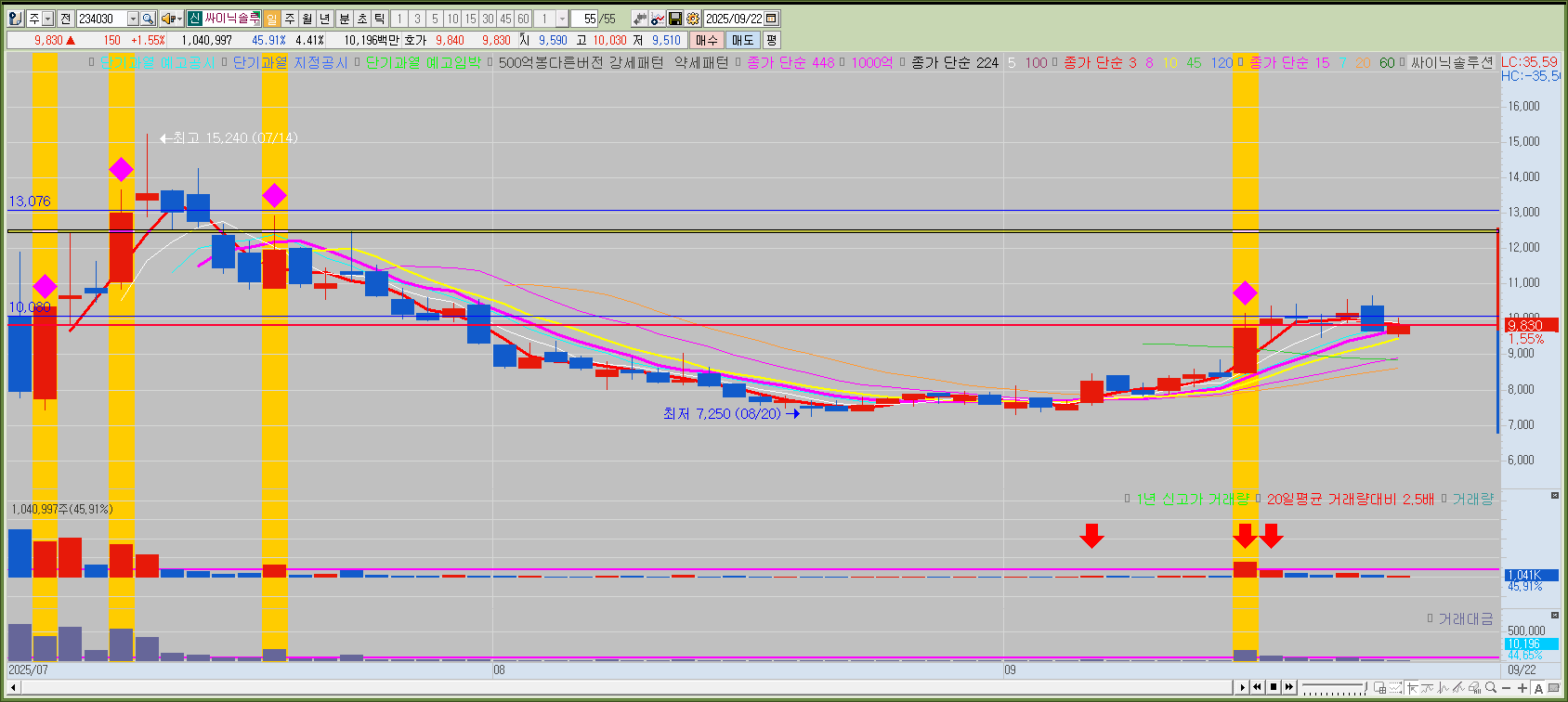 싸이닉솔루셔는 지난 7월7일에 상장한 신규상장주로, 국내 유일의 SK하이닉스시스템아이씨의 디자인 솔루션 파트너사다. 온디바이스AI, AI반도체등으로 향후 지속 부각받을 가능성이 높은 기업인만큼 지속적으로 관심을 갖고 공부해봐도 나쁘지 않은 기업이라고 생각한다. 게다가 최근에는 반도체 시황이 지속되면서 SK하이닉스와 삼성전자가 하드캐리 중이기 때문에 더욱더 관종에서 지우지 말아야할 기업중 하나다. SK하이닉스가 신고가를 기록하거나 평소 보다 훨씬 강한 움직임을 보여주면 당일 매매를 고려해봐야 한다.