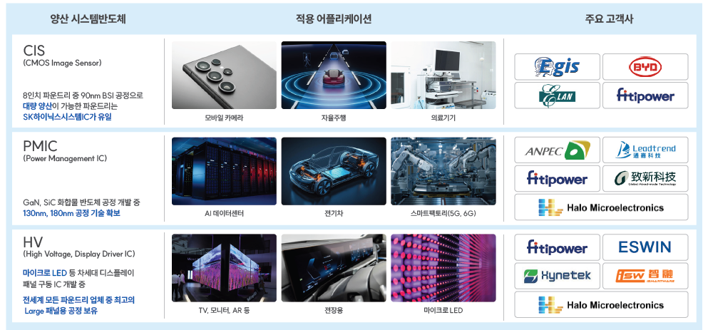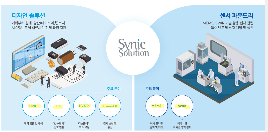 싸이닉솔루션은 시스템반도체 디자인하우스 전문 기업이다. 전력관리 반도체, 이미지 센서, 디스플레이 구동 반도체 등 첨단산업에 필수적인 반도체를 중심으로 국내외 220개 이상의 팹리스 고객사와 협업했다.싸이닉솔루션은 BYD, ESWIN, GMT 등 글로벌 팹리스의 고객 기반을 확보하고 있다. 또 SK하이닉스시스템IC의 유일한 디자인하우스로서 파트너십을 이어가고 있다. 이외에도 SK키파운드리, 대만의 PSMC 등 글로벌 주요 파운드리와의 협력을 통해 멀티 파운드리 기반 수직적 디자인하우스 역량 강화를 추진하고 있다.싸이닉솔루션은 센서 파운드리 사업으로 밸류체인 내 수평적 확장도 본격화하고 있다. MEMS 마이크로폰 센서 및 MEMS 초음파 센서, 근적외선 센서를 고객사와 함께 개발 중이며, 올해 하반기 MEMS 마이크로폰 센서를 시작으로 양산을 본격화해 나갈 계획이다.