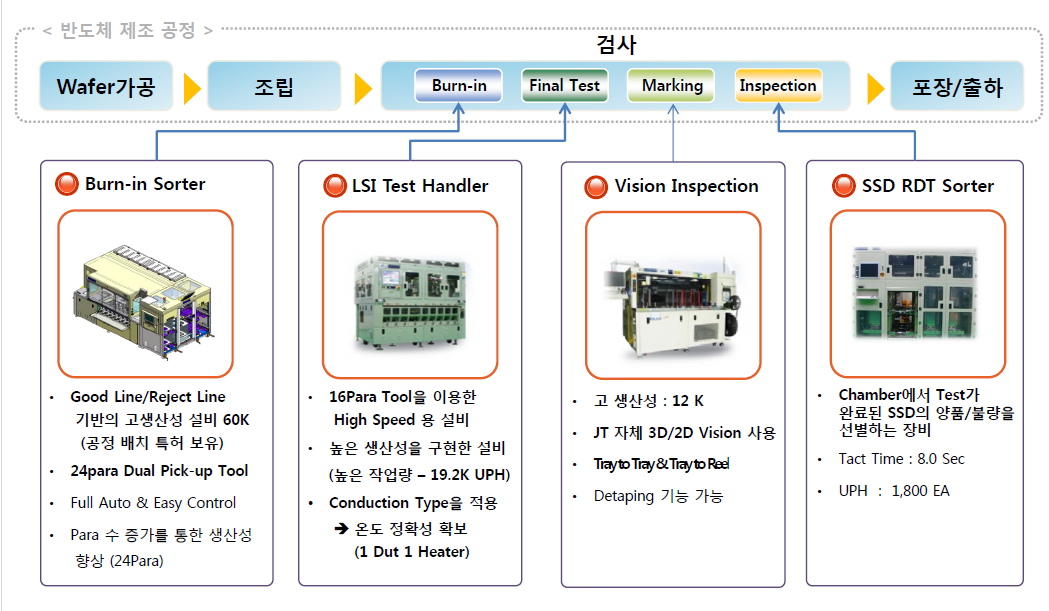 제이티는 메모리 반도체 후공정에 사용되는 번인 소터를 전문으로 개발, 생산하고 있다. 주력제품인 번인소터 분야에서 글로벌 1위 경쟁력을 보유하고 있으며, D램 반도체 글로벌 1, 2, 3위 업체에 번인 소터를 거의 독점적으로 공급 중이다.