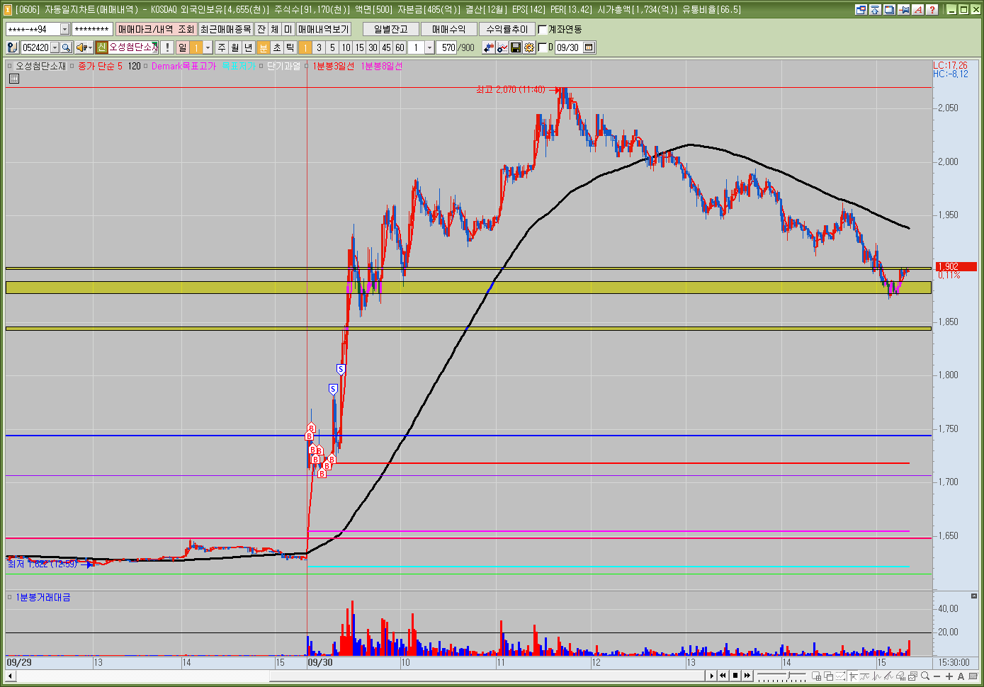 ![]() 분봉 : 시가 갭상승, 시가 깨고 하락하는듯 했으나 시가 재돌파 및 지지후 슈팅