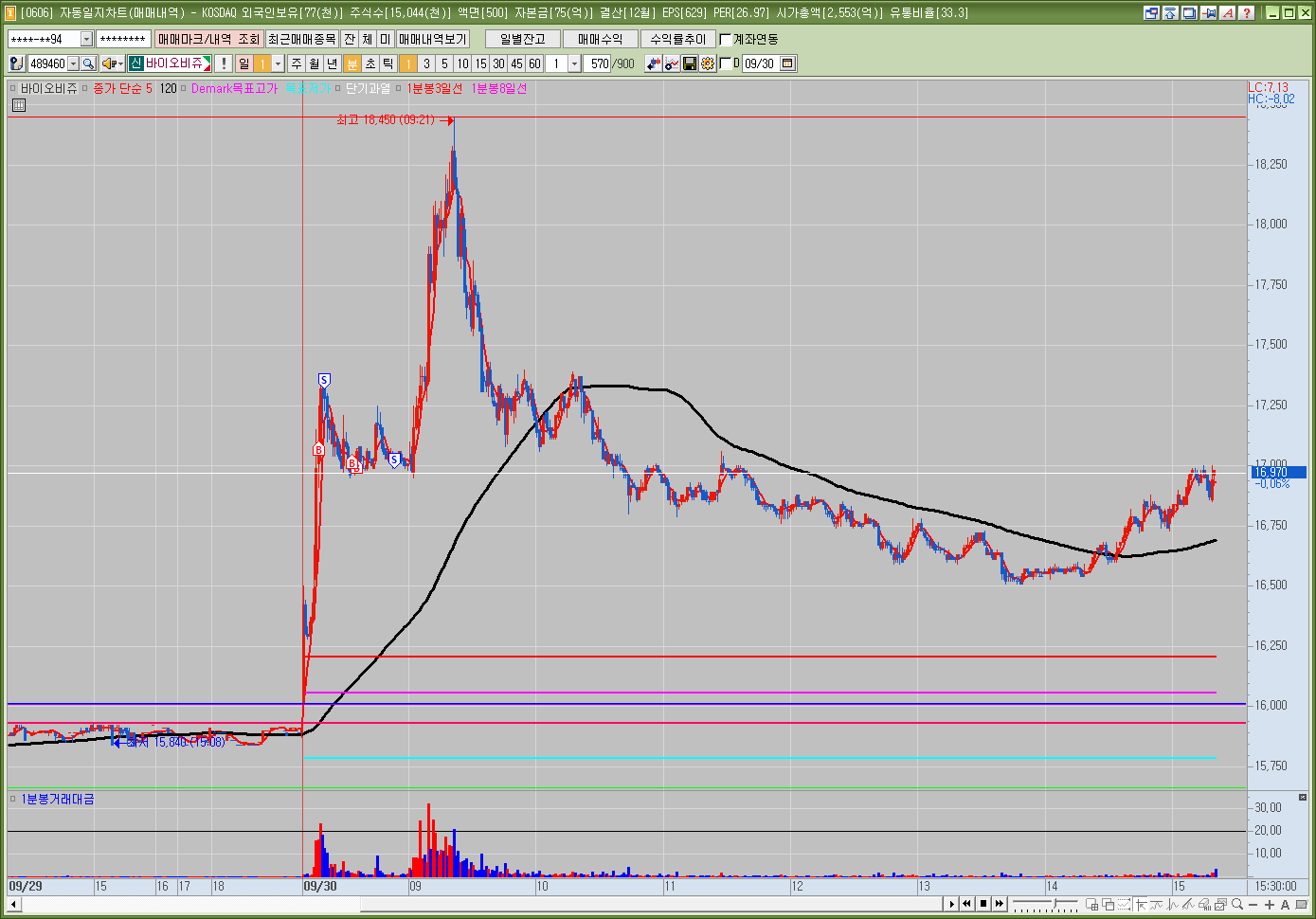 ![]() 분봉 : 시가 갭상승 디마크상단 지지후 슈팅 장후반 120분선 및 시가 다시 잡아주면서 반등