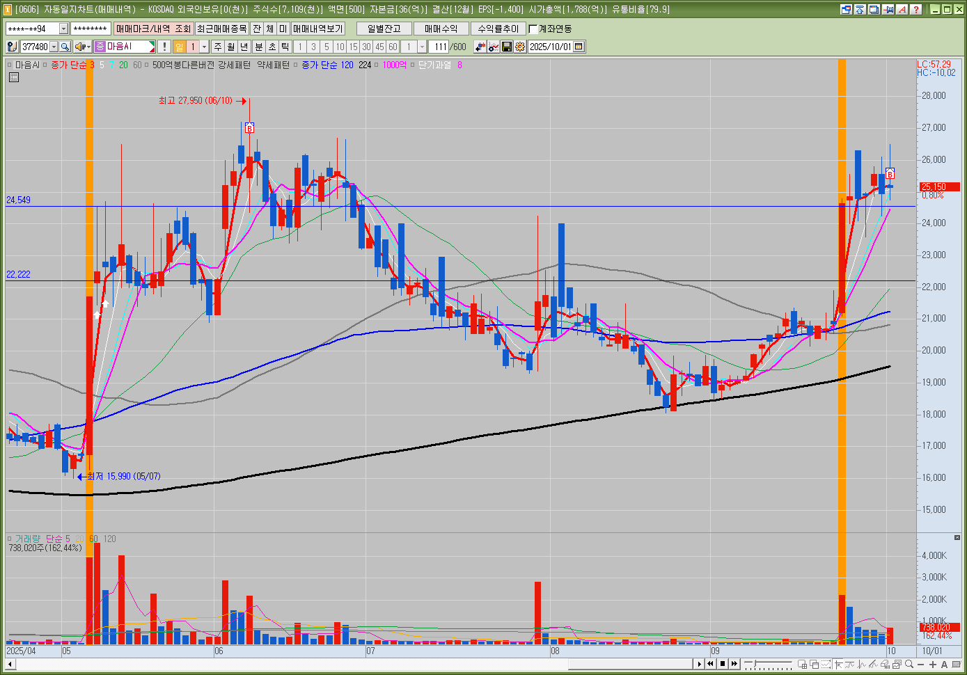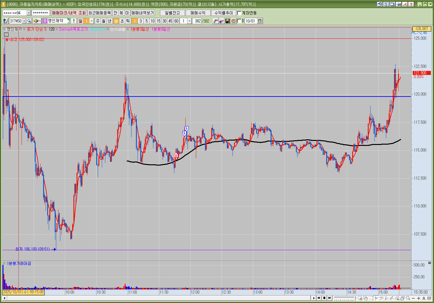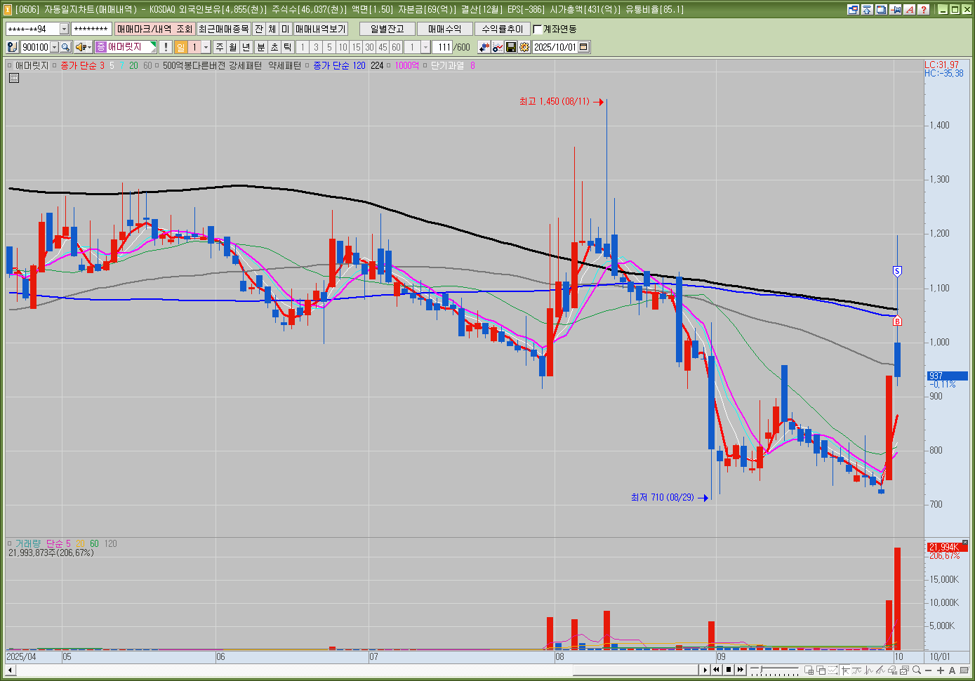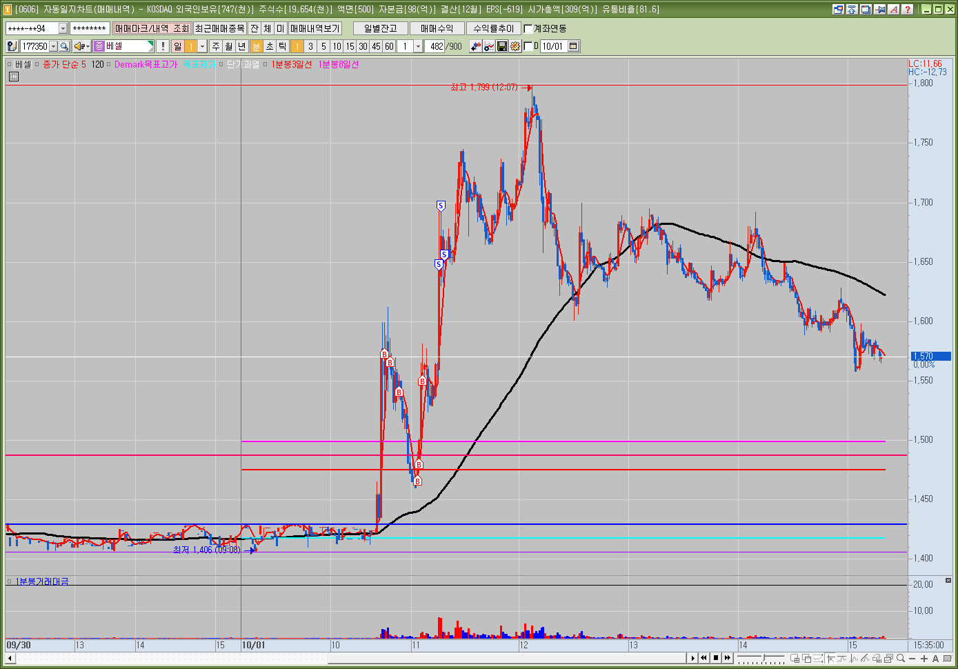 9월29일 거래대금 390억으로 상한가 마감하고 다음날도 시가 갭띄우고 전일 종가도 지지해줬다. 9월29일 기준봉에서 5일선 부근에서 지지해주면서 120분선 및 시가 지지하는 모습을 확인한 상황에서 특징주 나오면서 분봉이 강하게 반등했다.