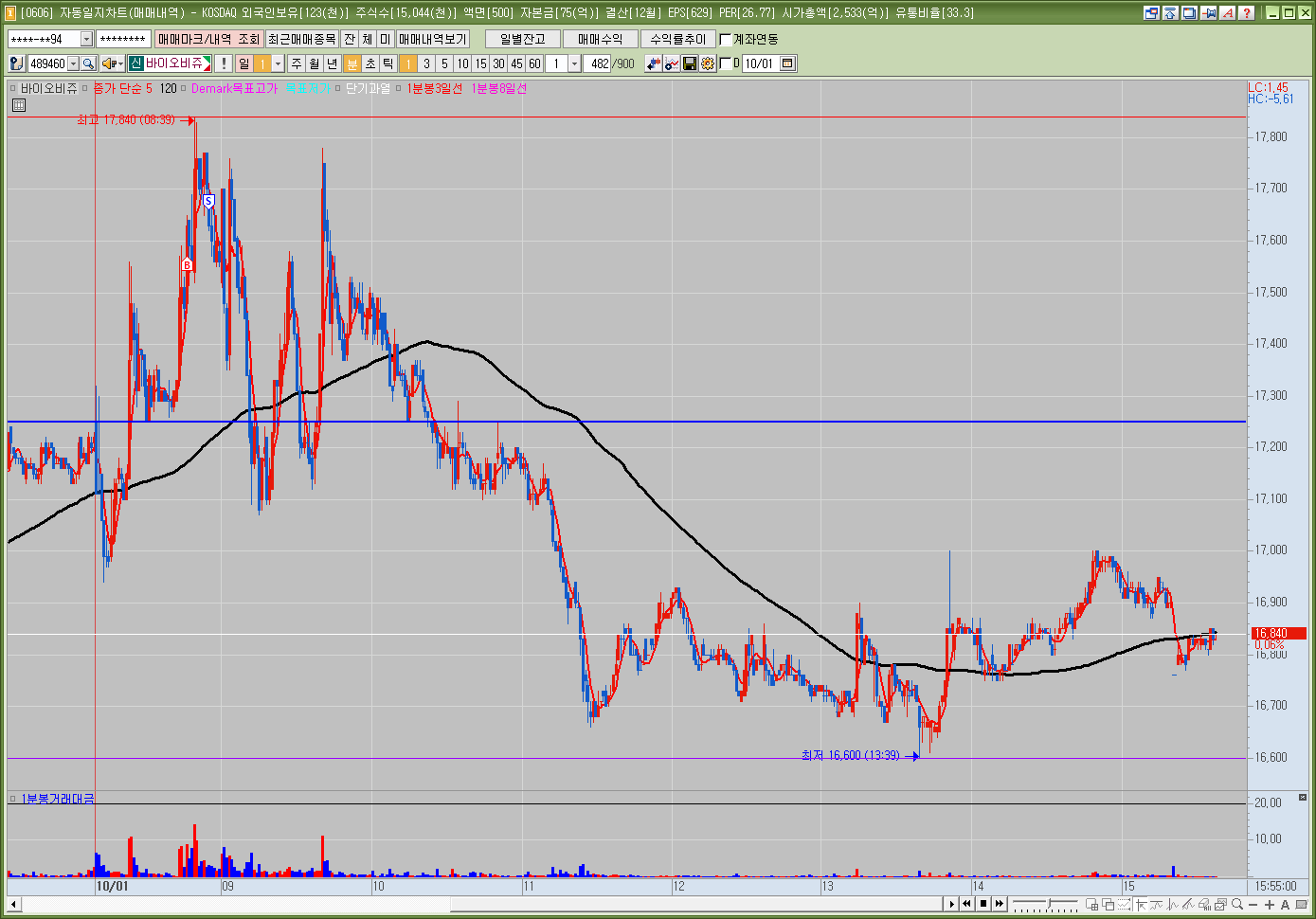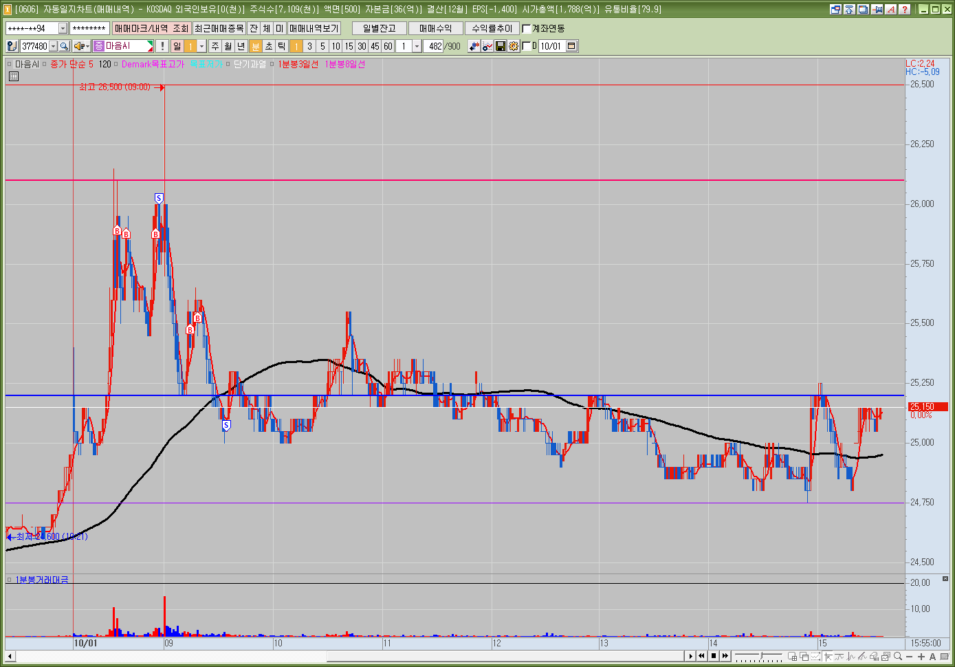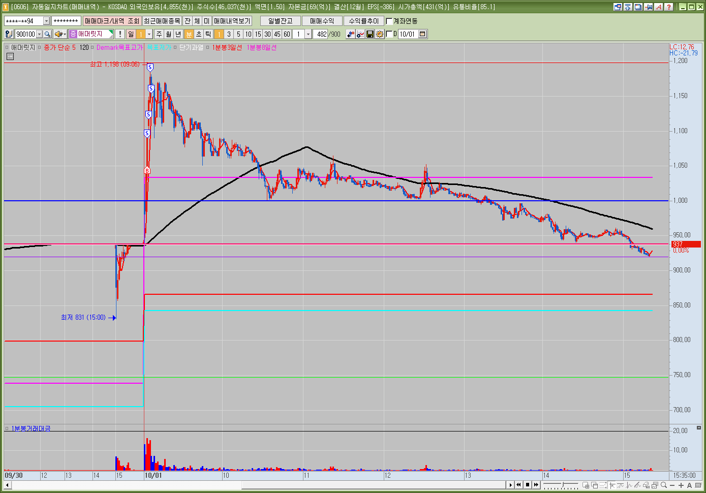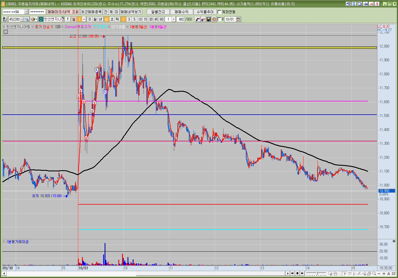 ![]() 분봉 : 재료 표출되면서 시초 거래대금 들어오면서 강하게 반등 이후 120분선 지지 못하고 하락해다가 다시 120분선 재돌파, 이후 변동성 보이면서 하락
