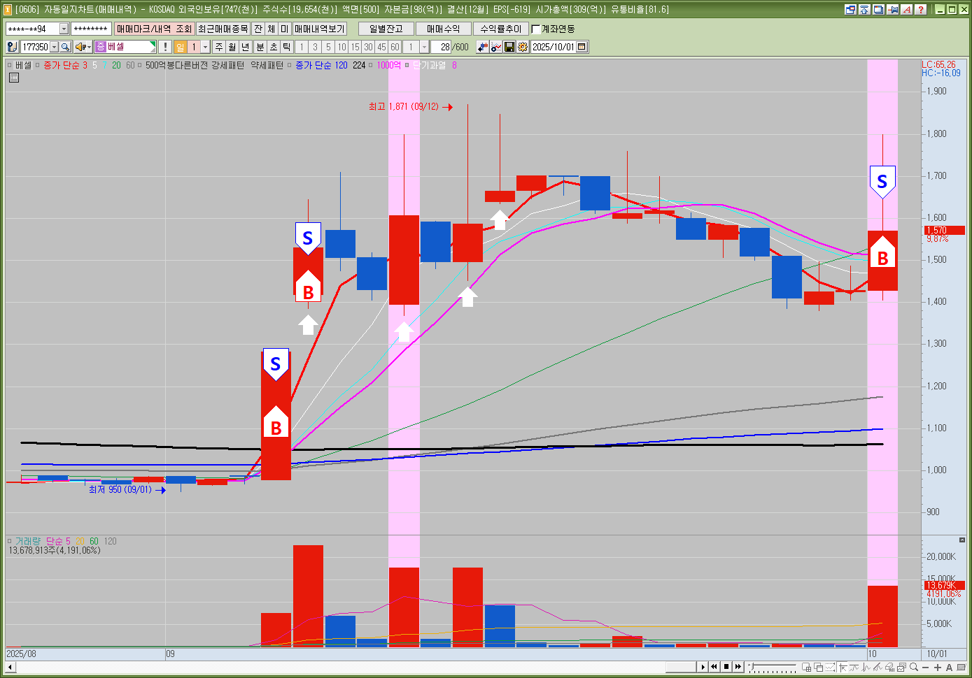 일봉 바닥에서 중국 지리자동차 재료 표출되면서 분봉 강하게 반등 224일선에 붙여주는 모습 확인
