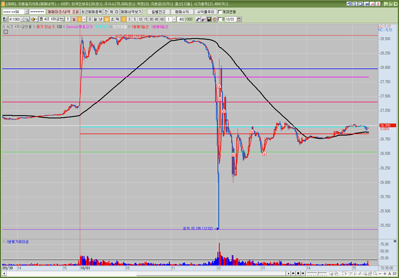 ![]() 분봉 : 120분선 깨고 급락 하락 vi 이후 시가부근까지 급등 이후 210분선 및 디마크하단 지지