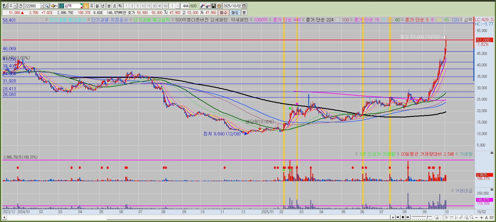 52주 신고가는 진작에 넘어섰고 계속 가파르게 우상향 중이다. 지난 2022년3월에 형서된 58,300원 역사적 신고가도 멀지 않아보인다. 데이트레이더라면 신고가 매매를, 스윙 투자자라면 전환사채 물량 출회, 시장의 변동성등을 기회로 삼아서 조정을 줄때 접근하는 것이 좋아보인다.