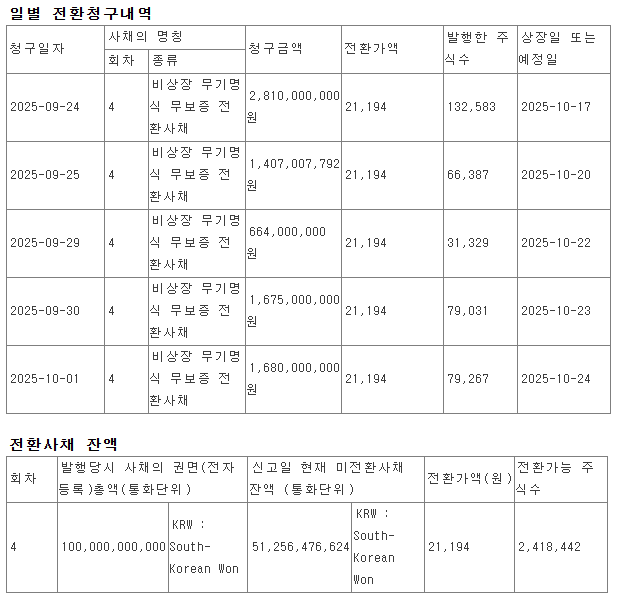 4회차: 전환청구가능기간 2025.03.12~2029.02.12, 전환가액 21,194 (2025.10.01 종가 기준 주가 47,650원)