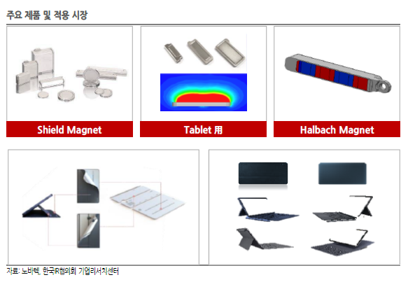 노바텍은 자력의 차폐 기술을 보유한 기업으로 태블릿 PC와 스마트폰에 들어가는 차폐 자석 및 태블릿 북커버에 들어가는 Magnet Plate를 주력으로 생산하고 있다. '차폐 자석'(Shield Magnet)이란 전자기기에서 방출되는 자력을 차단하는 용도의 자석으로, 스마트폰의 6면 중 디스플레이 방향을 제외한 다른 방향으로 자력이 방출되는 것을 제어하고, 태블릿 PC의 펜슬과 기기간 자력 간섭을 방지하는 역할을 수행한다.이 회사의 주요 고객사는 삼성전자로 현재 갤럭시탭 기종 중 S 시리즈에 차폐 자석과 태블릿 PC용 북커버 내부에 들어가는 Magnet Plate를 납품하고 있다. 올해 하반기부터는 폴더블 스마트폰 기종 중 하나인 갤럭시폴드향 납품이 시작되었으며, 내년부터 플립향 매출 발생 예정으로 자석 부문의 실적 증가가 전망된다는 것이 리서치알음의 진단이다.