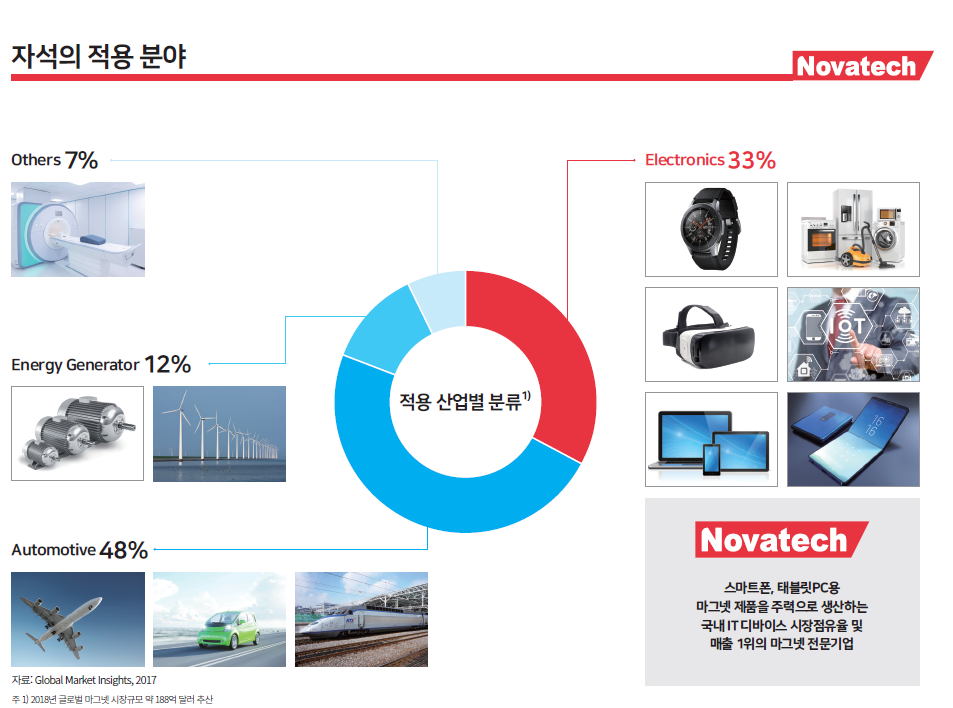 이베스트투자증권에 따르면 노바텍은 네오디뮴 자석(NdFeB, 희토류 금속계 자석)을 이용한 응용자석 사업을 영위하고 있다. 적용분야는 현재 태블릿PC, 스마트폰에서 신재생에너지와 자동차 분야로 확대되고 있다."향후 스마트폰 무선충전기에 적용될 가능성도 있다"며 "또한, 로봇 시장이 확대될 경우 관절용 차폐자석에 사용되는 응용자석 수요가 증가할 가능성이 있다"고 내다봤다