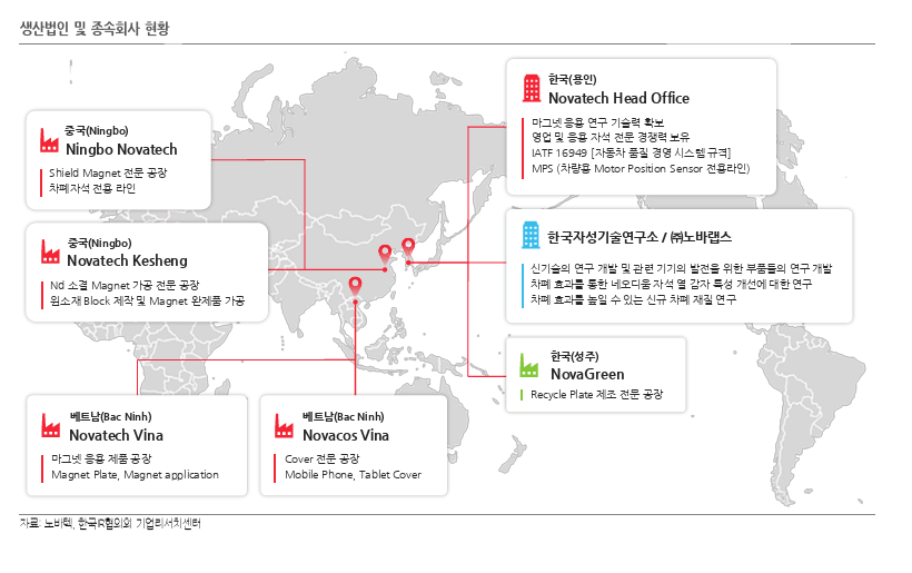 노바텍은 2022년 지난해 중국 닝보시에 위치한 닝보 노바텍의 생산능력 확대를 위해 증설투자에 착수했다. 신공장은 인저우구에 위치해 있다. 이번 신공장은 쉴드마그넷 기준 월 5000만개 생산죽이 가능하며, 이로 인해 년 매출 케파 1700억원까지 생산 가능한 대규모 공장이다. 기존 닝보 노바텍 생산능력 대비 4배이상 확대된 것이다.만약에 원재료를 수출금지하게 될 경우 자석제품을 만드는 기업체들은 중국에 대규모 조립공장을 설립하거나 중국 이외 지역에서 생산되는 자석블록을 수입해 관련 완제품 등을 생산할 수밖에 없다.또한 노바텍은 중국 정부의 움직임에 발맞춰 관계사인 노바텍 커승을 통해 충분한 네오디뮴 자석블록을 미리 확보하고 있는 것으로 파악됐다.
