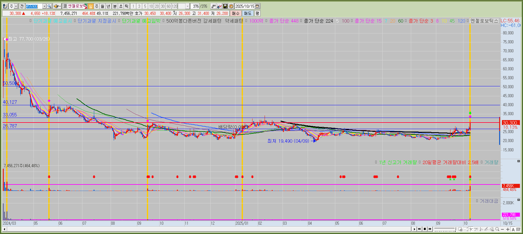 다른 로봇주들에 비해 상대적으로 주가는 바닥이다. 의료 재활 로봇 관련 재료가 구체적으로 붙어주면 더 좋겠지만 최근 적극적으로 IR을 하는 것 같아보이지는 않는다. 일봉상 224일선 부근 지지 체크한 뒤에 매매를 고려하는게 좋아보인다. 최근 시장에서 크게 관심을 보이는 종목은 아닌 것으로 판단된다. 단타라면 로봇시 황이 강하게 들어올때 매매를 고려해야 한다.