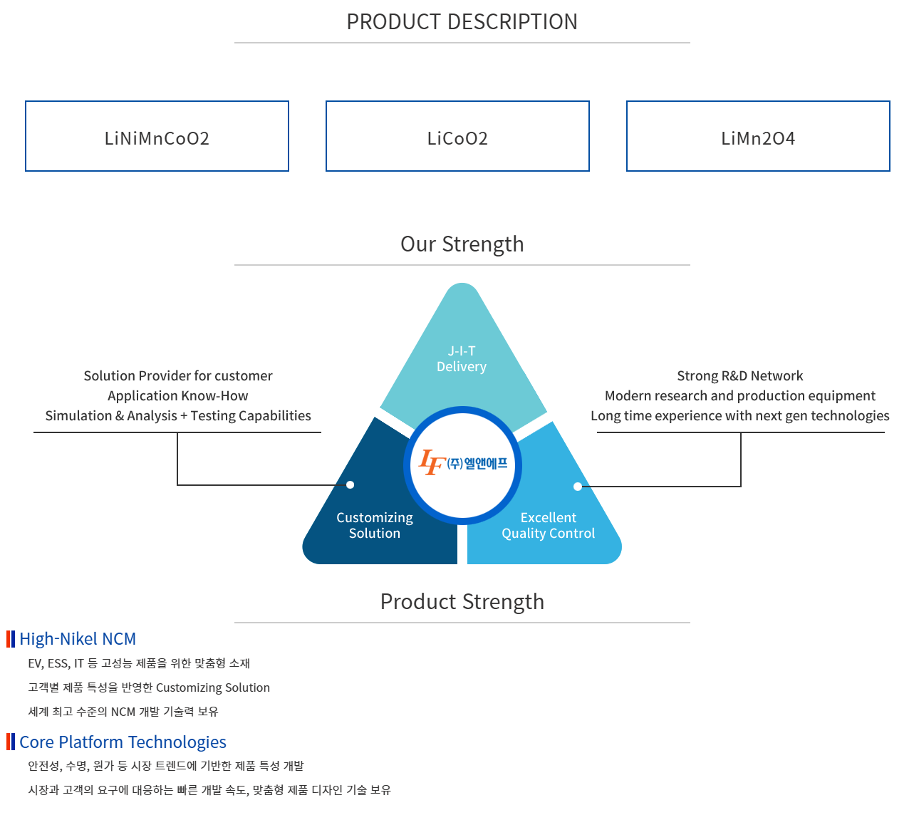 업계에 따르면 엘앤에프가 전기차 배터리에 들어갈 LFP 양극재 개발에 들어갔다. 자세한 양산 일정은 확인되지 않았지만 전기차 배터리 탑재를 목표로 고객사와 개발을 진행하고 있다. 엘앤에프 관계자는 “다수 고객사와 협력해 LFP 양극재를 개발하고 있다”고 전했다. 회사는 LFP에 망간을 추가한 LFMP 양극재를 개발하고 있는 것으로 파악됐다. 제품군을 갖춰 다양한 글로벌고객 수요에 대응하는 전략으로 풀이된다. 엘앤에프는 세계 최대 전기차 업체인 테슬라와 협력 관계가 깊어 LFP도 협력할지 귀추가 주목된다.