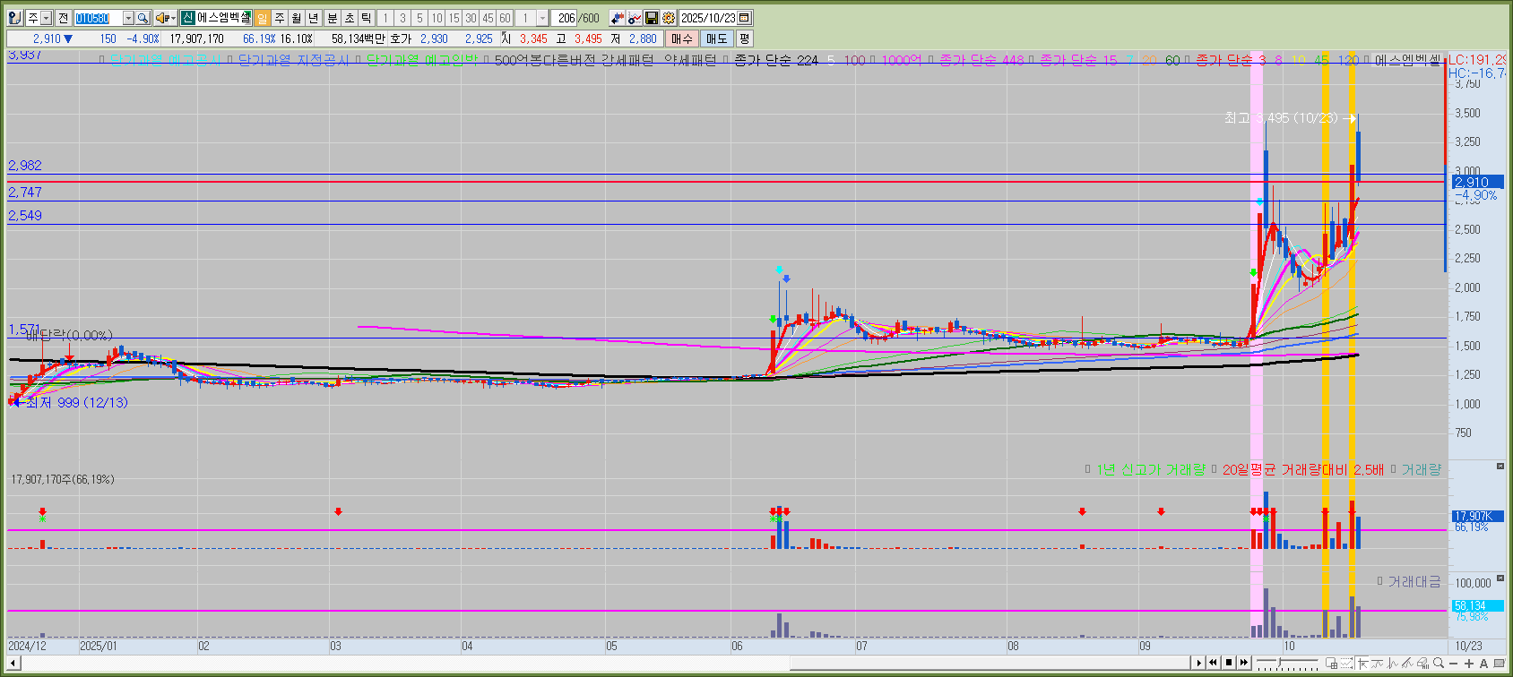 어제 760억이 넘는 거래대금으로 상한가에 들어간 뒤에 오늘 시가를 9%넘게 띄우며 강하게 상승했으나 장후반에 지수 하락과함께 상승분을 모두 반납했다. 과대 낙폭으로 3일선이나 5일선 부근에서 기회를 줄가능성이 높아보인다. 참고로 관세협상이 최종 완료되면 관세 재료 관련해서는 더이상 기대를 하지 말고 셀온 시그널로 인식하는게 정석이다. 기대감까지만 매매하는게 맞다.