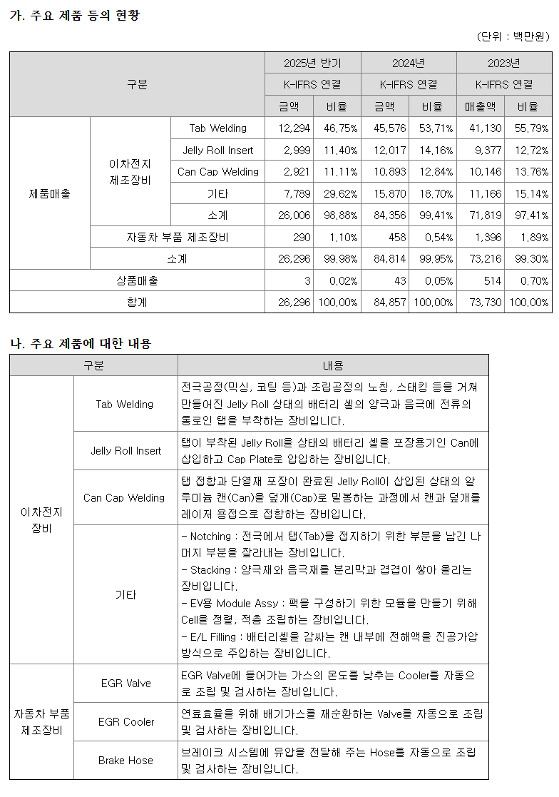 각형 배터리 조립설비 중 탭웰딩 장비를 삼성SDI에 10년 이상 독점 공급하고 있는 핵심 협력사다. 현재 전체 매출에서 삼성SDI가 차지하는 비중이 90%에 이른다.