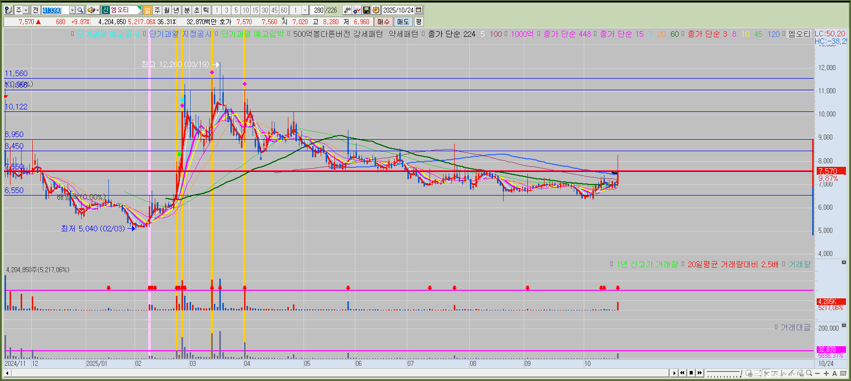재료도 좋고 끼도 꽤나 좋은 종목이기 때문에 계속해서 관심을 가져볼만하다. 6550원 정도를 계속 지지해주다가 오늘 이차전지 시황에서 강하게 반등해줬다. 사실 베스트는 오늘 224일선 및 120일선 밑에서 분봉 위로 반등줄때 시황 체크하면서 매매하는게 베스트긴했다. 이차전지 업황이 돌아오는 모습이 보이는만큼 224일선 및 120일선 기준으로 계속해서 트래킹해보면 좋을 것 같다. 지수가 빠져서 같이 빠지면 기회로 생각해볼 수 있을 것 같다.