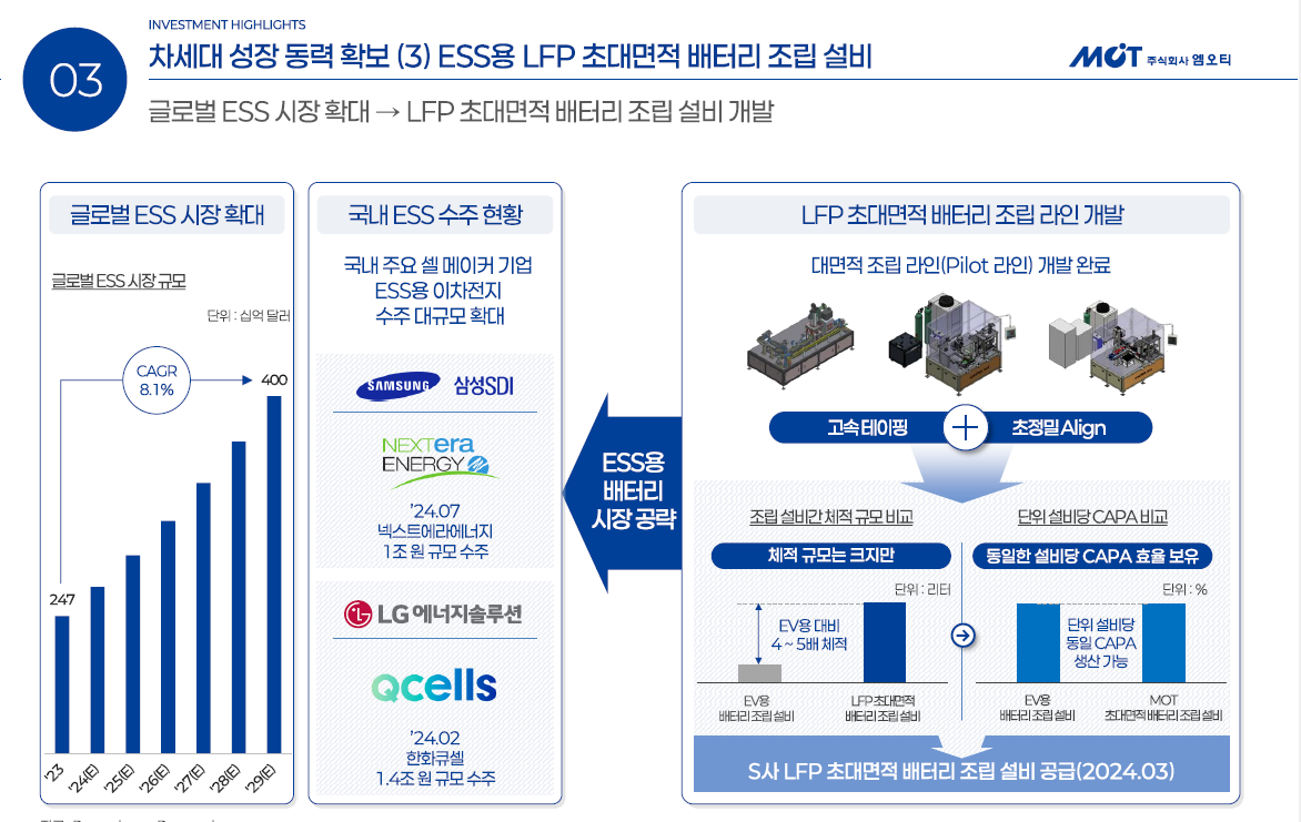 엠오티는 핵심 경쟁력인 고속 테이핑과 초정밀 얼라인 기술력을 더해 대면적 LFP 배터리 조립 설비(파일럿 라인)를 개발 완료했다. 자체 개발한 LFP 대면적 배터리 조립 설비는 EV용 배터리 조립 설비 대비 4~5배로 높은 체적 규모가 크지만 단위 설비당 생산능력은 EV용 배터리 조립 설비와 동일한 생산효율을 확보하고 있다. 지난 3월 삼성SDI에 LFP 대면적 배터리 조립 설비 개발 및 납품한 레퍼런스를 보유하고 있다.