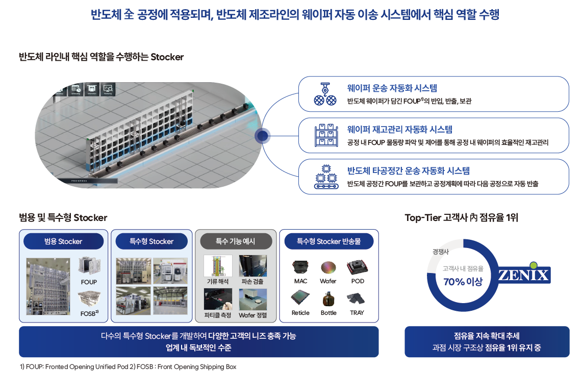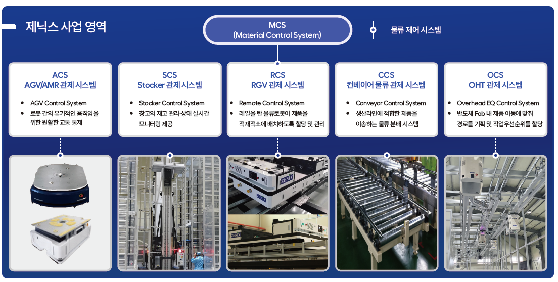 제닉스로보틱스는 자동화 물류 시스템(AMHS) 전문 업체로 세계 최초로 AGV(무인운반차) 및 AMR(자율주행 로봇)의 전체 제어 시스템을 자체 내재화했으며, 반도체, 디스플레이, 이차전지, 자동차 등 다양한 산업군에 자동화 물류 시스템을 공급하고 있어 로봇 수요 확대에 따른 수혜가 기대된다.
