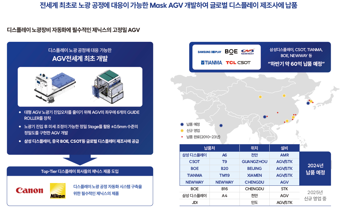 제닉스로보틱스 관계자는 “노광공정은 0.1mm의 미세 진동에도 불량이 발생할 정도로 정밀성이 요구되는 공정”이라며 “당사는 전세계 최초로 노광공정에 대응이 가능한 마스크 AGV를 개발해 삼성디스플레이, CSOT, BOE 등 글로벌 디스플레이 제조사에 납품하고 있다”고 강조했다. 이어 “자사의 마스크 AGV는 ±0.5mm 수준의 정밀도를 구현해 기존 외산 장비 대비 정밀도와 안정성을 크게 높였다”고 덧붙였다.