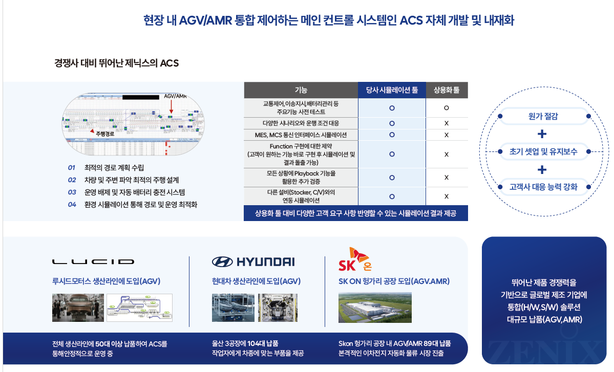 제닉스로보틱스의 강점은 세계 최초로 ACS를 내재화했다는 점이다. 기존에는 외산 소프트웨어와 하드웨어 간 호환성 문제가 잦았지만, 제닉스로보틱스는 경로 최적화·자동 충전·환경 시뮬레이션까지 포함된 ACS를 독자적으로 구현해 원가 절감과 유지보수 효율화를 동시에 실현했다. 이를 통해 반도체·디스플레이·자동차·물류 등 다양한 산업군에서 고객사를 확보했으며, 삼성전자·삼성디스플레이·현대자동차·SK온 등 국내외 글로벌 대기업이 실제 고객사로 꼽힌다.