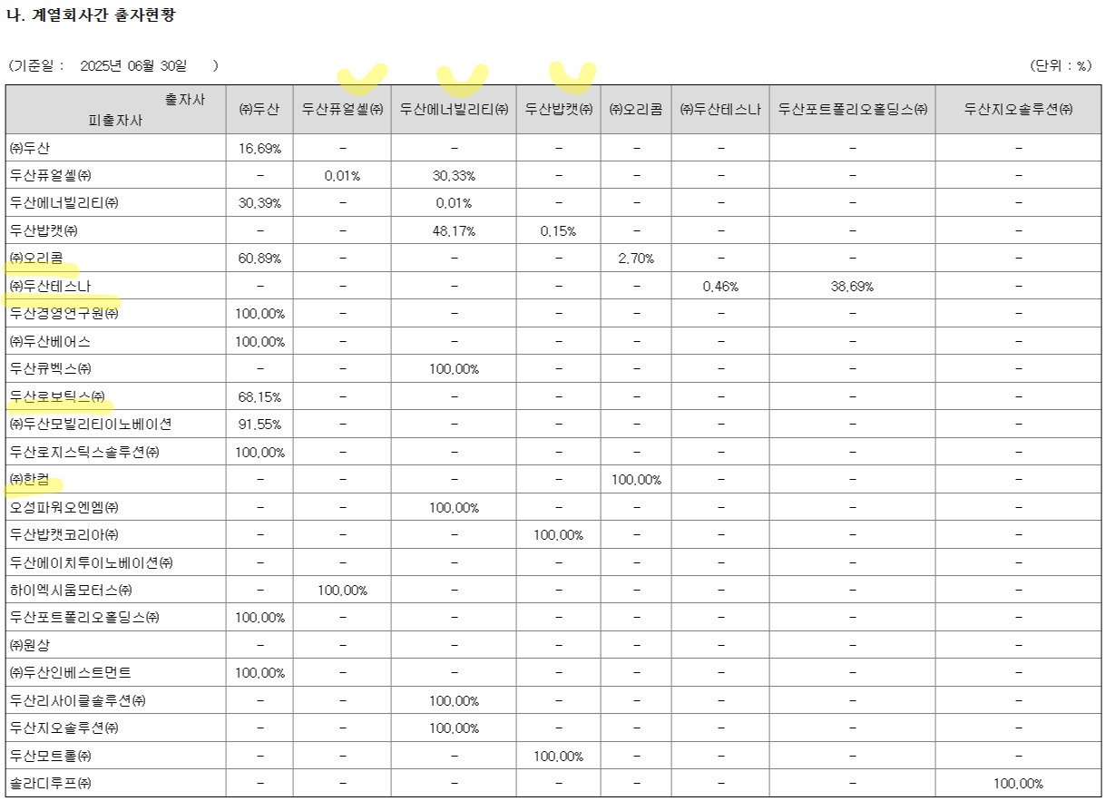 ● 상장된 계열사 : 오리콤, 한컴(한글과컴퓨터), 두산로보틱스, 두산퓨얼셀, 두산에너빌리티, 두산밥캣, 두산테스나