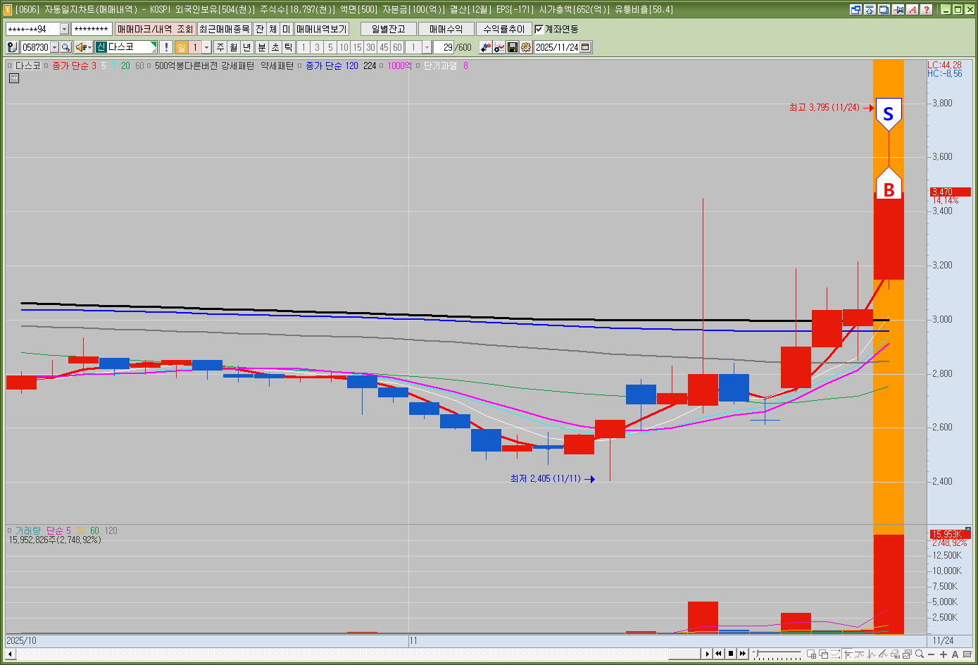 과대 낙폭으로 매매할 수 있었다. 시가도 나쁘지 않지만 120분선이 더 좋은 위치긴 했다. 수줄튀가 정답이다.