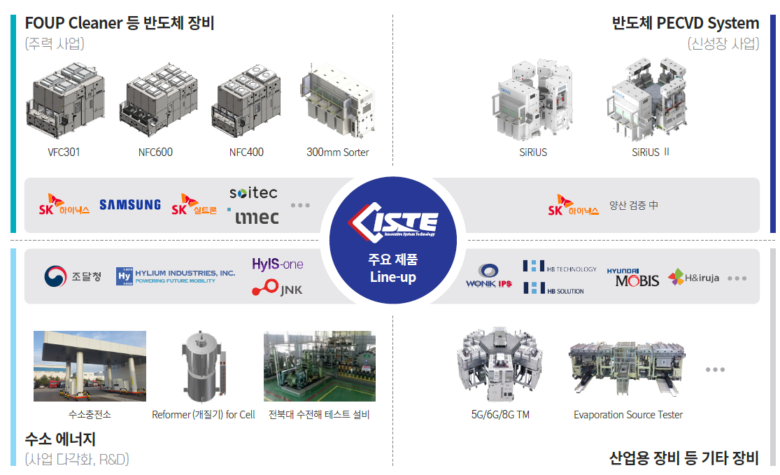 아이에스티이(ISTE)는 SK하이닉스, 삼성전자, 실트론을 포함한 국내외 13개 기업에 반도체 주력 장비인 풉 클리너(FOUP Cleaner) 장비를 공급하고 있다. 일반적으로 반도체 장비의 주요 고객이 IDM(종합반도체 기업)이나 파운드리 기업으로 한정되는 반면, 아이에스티이는 웨이퍼 제조업체, PLP(Panel Level Package) 제조업체, HBM(High Bandwidth Memory) 제조업체 등 다양한 고객군을 확보하고 있다.특히 지난해 FOUP 제조업체와 HBM 제조업체를 신규 고객으로 유치한 데 이어, 이번에는 반도체 후공정인패키징테스트(OSAT) 업체까지 고객층을 확대하면서 반도체 산업 내 입지를 더욱 강화하고 있다. 아이에스티이는 SK하이닉스에 2016년부터 반도체 세정장비인 FOUP Cleaner를 공급하고 있다. 지낸해 초 고대역폭 메모리(HBM)에 특화된 새로운 모델(400 Series)의 FOUP Cleaner 장비를 국내 최초로 개발하여 수주 및 공급하며 기술력을 입증하고 있다.또한, 2023년 SK하이닉스의 기술혁신기업으로 선정되어 전공정 핵심장비인 PECVD 데모장비를 공급해 양산 검증 중에 있다