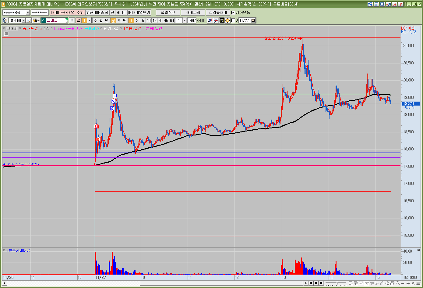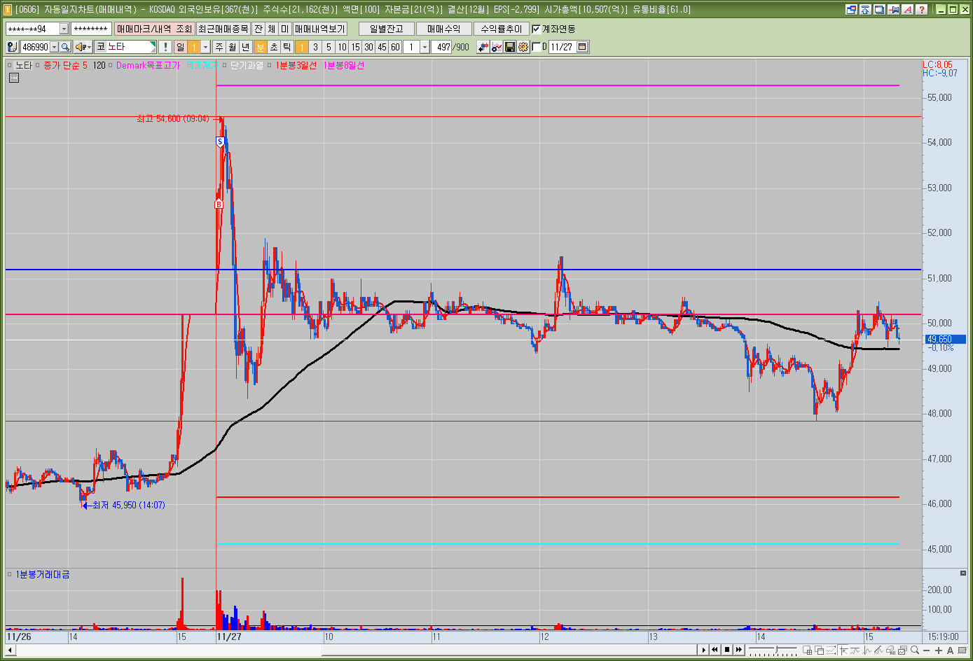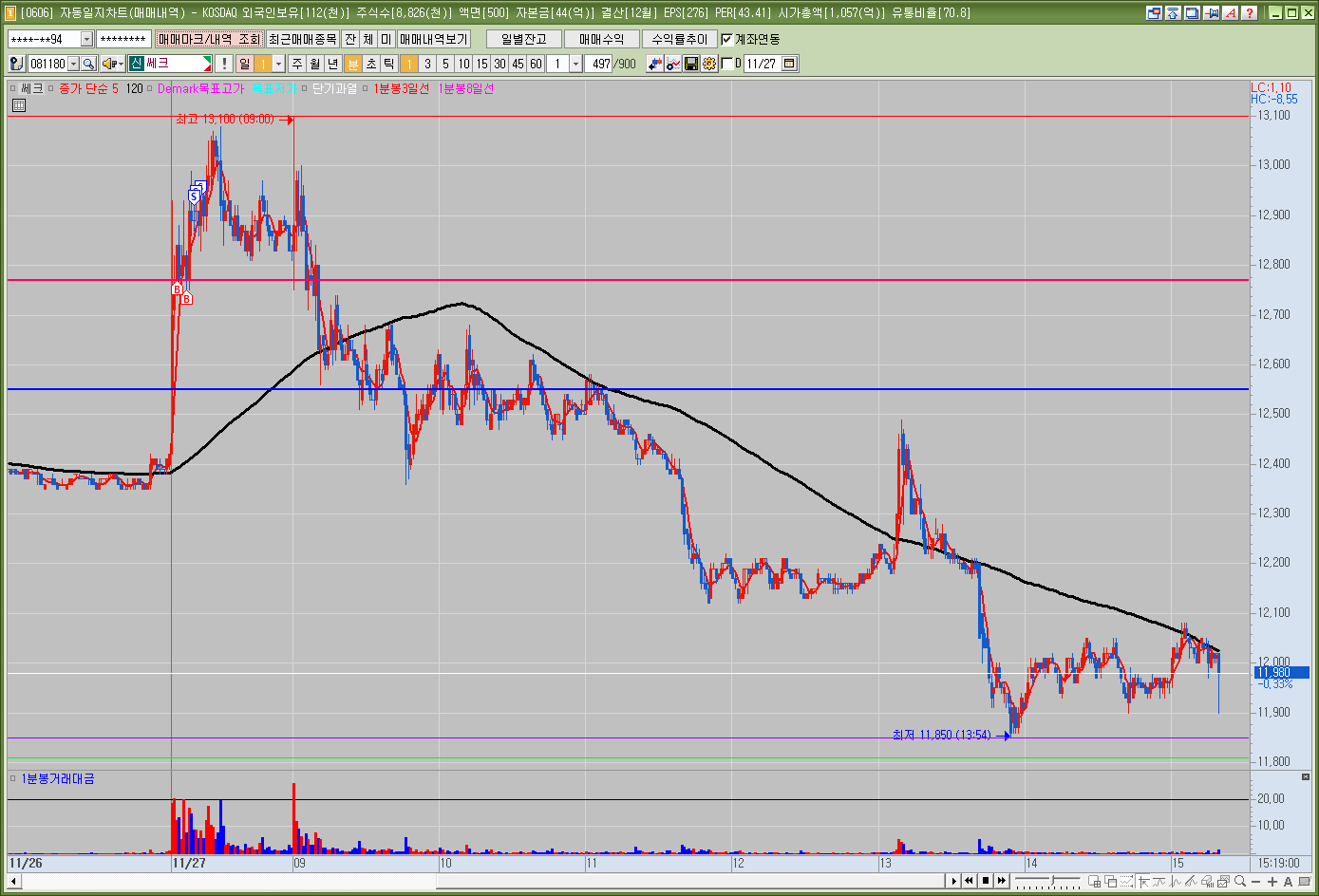 ![]() 분봉 : 시가 갭상승 이후 시가 및 120분선 지지 못하고 조정, 이후 일봉상 3일선 부근에서 분봉 지지해주면서 120분선 재돌파