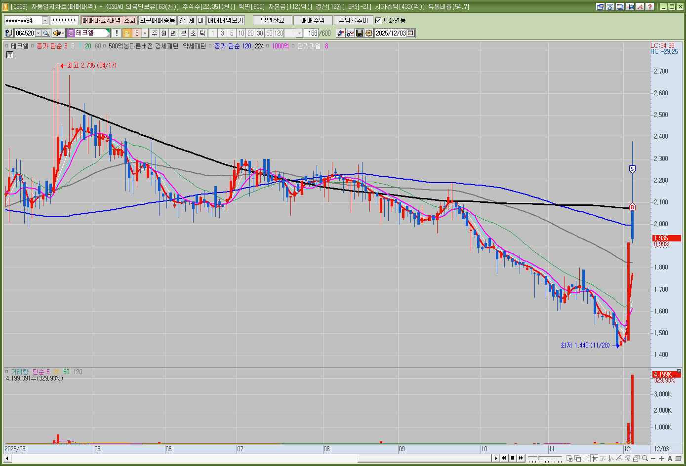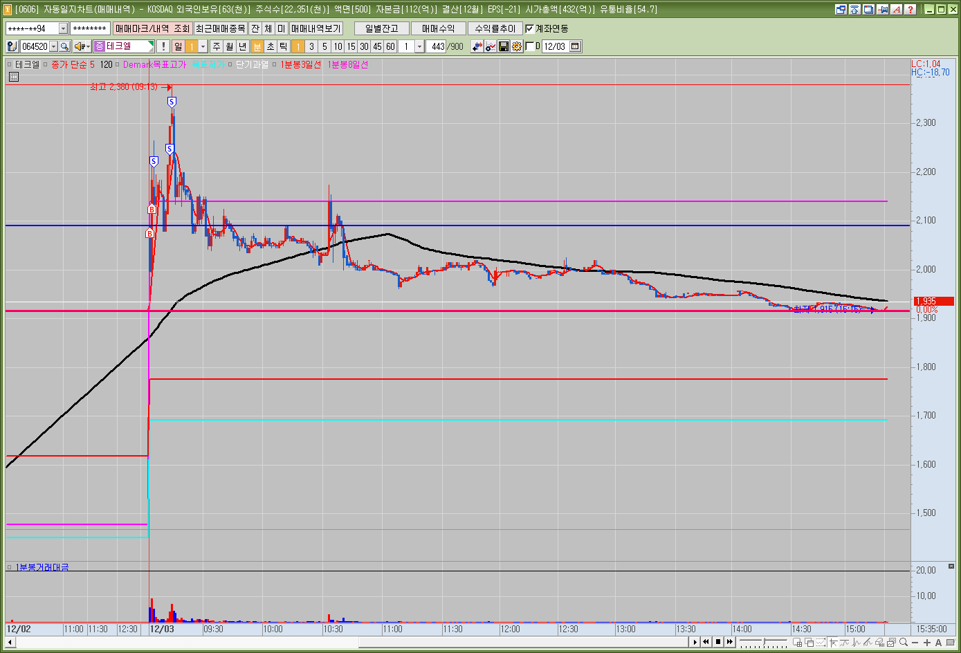 ![]() 분봉 : 시가 갭상승 이후 시가 지지해준뒤 슈팅 이후 시가 및 120분선 지지 못하고 하락