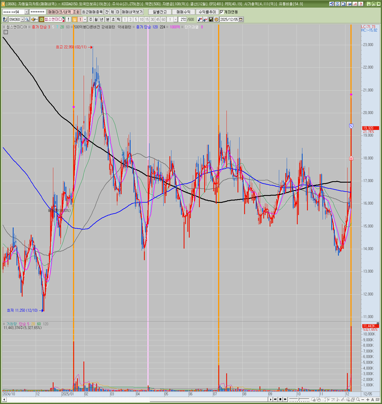 장전에 3자배정 유상증자 재료 나왔고 일옵상 시가 224일선 부근에 붙어서 분봉 튀는 모습 확인