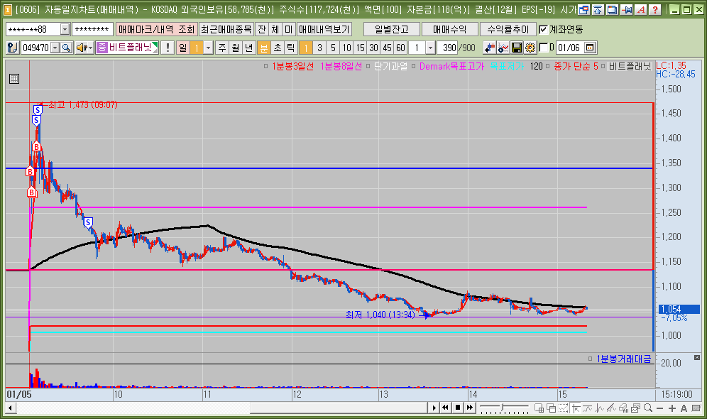 욕심 부리지 않고 매매했다. 시가 갭 의치가 좋았고 1분봉 첫 봉에서 거래대금이 평솨와다르게 많이 터진 것을 체크하고 매매했다. 호가가 원가 얇아서 비중을 강하게 태우기는 어려운 종목이다. 손절하긴 했지만 이번에는 수익금도 홀딩해보았다. 손절하게 되더라도 어차피 전체 계좌는 수익이기 때문에 수익금은 일정한 기준을 갖고 좀더 길게 가져가는 연습을 계속 해보자.