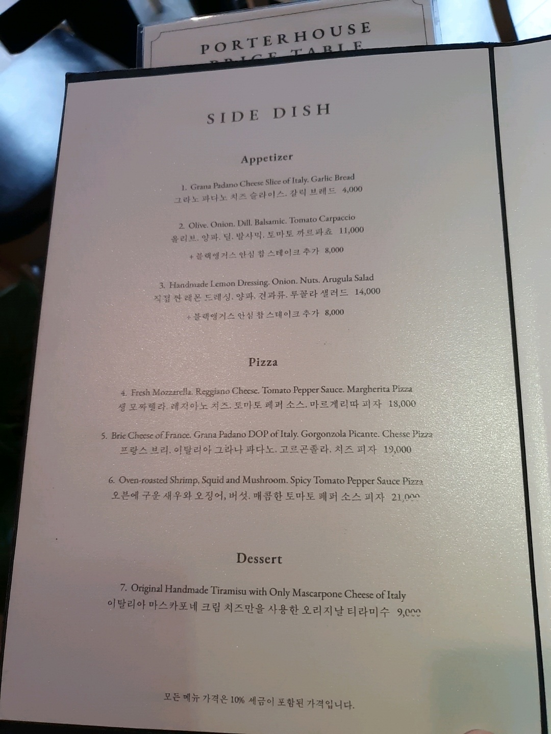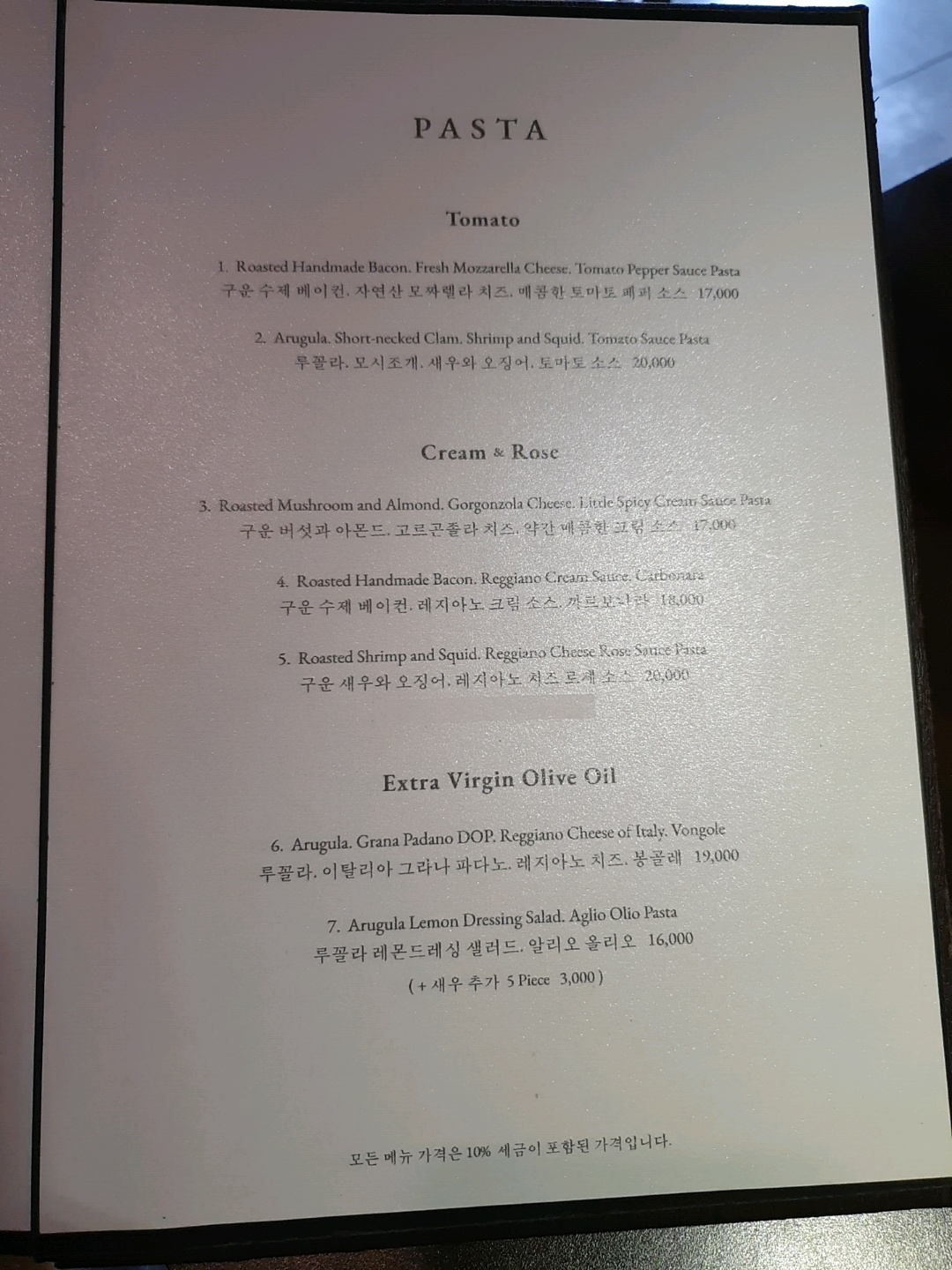 일반적인 이탈리안 레스토랑에서 으레 제공되는 식전빵 등은 제공되지 않았고, 음식이 나오기 기다리는 동안 두 개의 코인 물티슈ㅎㅎ와 올리브유가 살짝 뿌려진 올리브가 제공되었다.